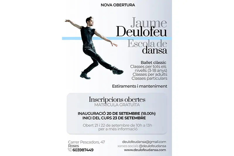 Roses Demà s’inaugura a Roses l’Escola de Dansa Jaume Deulofeu Jaume Deulofeu és un ballarí professional de Roses que després de treballar per tota Europa compleix el seu somni d’obrir la seva pròpia Escola de Continua llegint 19 de setembre de 2024